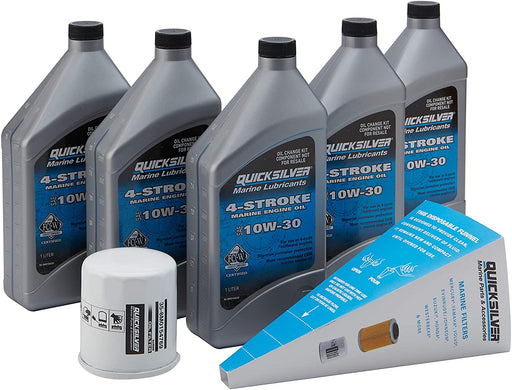 Kit includes 5L/1.14 gallons of Quicksilver 10W30 4-stroke oil, filter, drain plug seal, drip tray (as applicable). Provides necessary items for y...