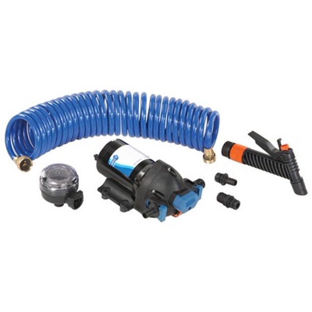 Par-max Washdown Pump Kit jabsco 32902-0092 Pump/Strainer/Nozzle/Hose 5.0 GPM Hose 25' PSI 50 12V : Compact efficient corrosion resistant 3 chamber diaphragm pump can run dry without damage. Includes Pumpgard strainer nozzle 25' hose coil and 3/4" hose barb fittings. Sealed pump head and motor self-priming up to 6'. ISO 8846 Marine ignition protection.