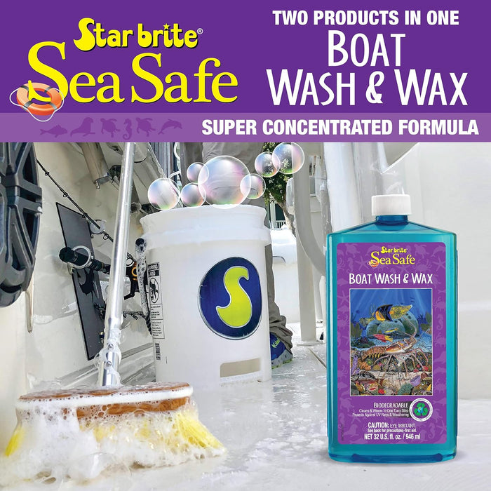 Sea Safe Boat Wash & Wax cleans and polishes in one step; saving you time and effort. Powerful cleaning agents loosen dirt and grime from fiberglass; vinyl; painted surfaces; metal; glass; plastic; rubber and more so that it can be rinsed away. Special polymers then bond to the surface to provide a shine and UV protection. The formula does not contain any phosphates or harsh chemicals; yet it is extremely effective at cleaning all surfaces of the boat. By using Wash and Wax every time you clean the boat; you also stretch the time between waxing or polishing it.89737;89737P. Features •Cleans; shines and protects in one easy step. •Concentrated for economical use. •Leaves a protective polymer coating on surface. •Biodegradable; environmentally friendly formula. •No hard rubbing or buffing required. •Low Sudsing; contains no phosphates. •Cleans fiberglass; vinyl; painted surfaces; metal; rubber; plastic and more •Low-sudsing formula conserves water; works in fresh and salt water •Strips away dirt but will not remove existing wax or polish •Special polymers bond to surface to provide shine & UV protection •Two products in one — A powerful boat wash and a durable wax too •Concentrated formula is extremely powerful and economical to use — three capfuls cleans and waxes a 25¹ boat